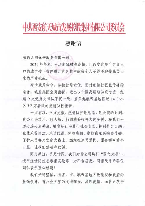 近期,龍翔保安收到一封來(lái)自中共西安航天城發(fā)展控股集團(tuán)有限公司委員會(huì)的感謝信,信中充分肯定了我公司保安員毋云鵬、張佳樂(lè)等同志在疫情防控期間認(rèn)真負(fù)責(zé)、勤懇務(wù)實(shí)的工作態(tài)度。