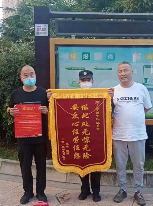 9月5日下午,失主王師傅送來(lái)“保此處無(wú)驚無(wú)險(xiǎn),安眾心任勞任怨”的錦旗和一封感謝信,表達(dá)他們對(duì)龍翔保安的由衷謝意。